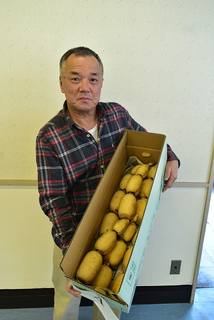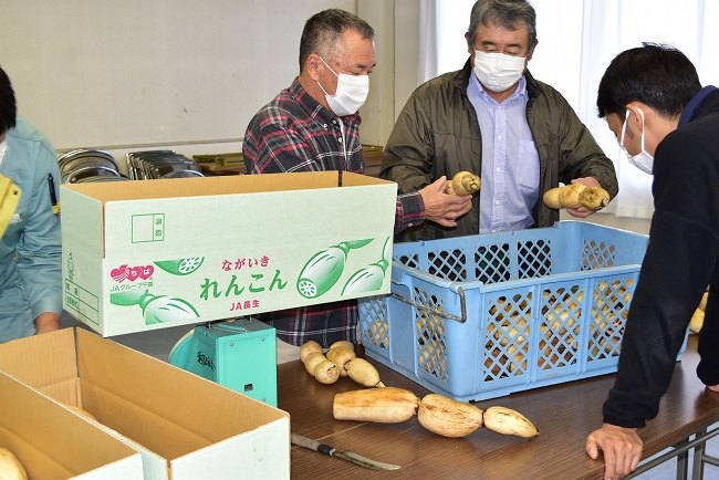 長南支所にて、レンコンの共進会を開催しました。量目、形状、箱内の揃い等を審査しました。厳正な審査の結果、田中和弘さんが最優秀賞に輝きました。