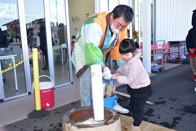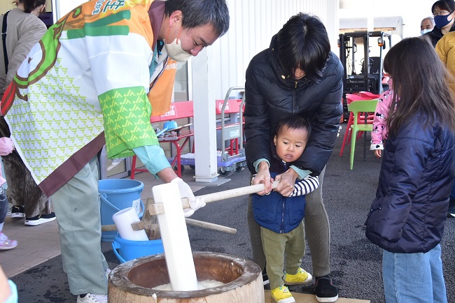 つきたてのお餅の販売と餅つき体験を行い、来店した子供たちと一緒に声を合わせながらお餅をつきました。始まる前から列ができ、どちらも大好評でした。ご来店いただいた皆様ありがとうございました!