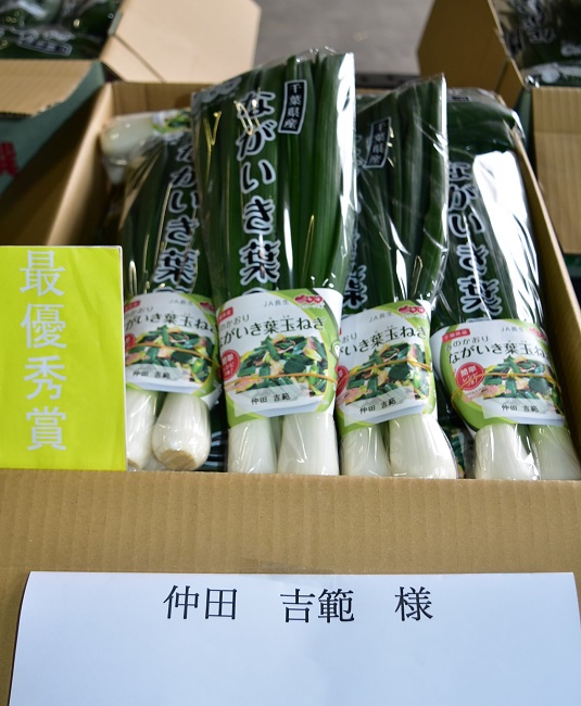 白子選果場にて葉玉ねぎ共進会が開催され、長生農業事務所、JA全農ちば、市場関係者らが出席しました。葉や玉の色つや、箱内の揃い、荷姿の美しさの4項目について審査を行いました。白子町と長生村の生産者より10点の出品があり、厳正なる審査の結果白子町の仲田吉範さんが最優秀賞に輝きました。