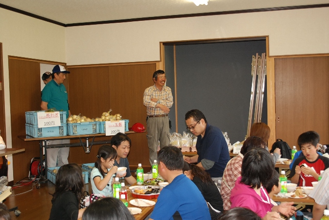 田植え修了後、JA長生産野菜を使ったトマトスープやJA長生女性部が作ったおにぎり、オードブルが振る舞われ、参加者はおいしいと頬張りながら食べていました。