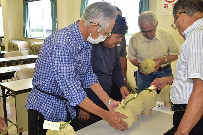 JA長生施設野菜部会アールスメロン部は、JAグリーンウェーブ長生にて令和6年産アールスメロン目揃え会を開催しました。出荷を目前に、生産者、市場関係者、JA職員ら約30名が参加し、情勢報告や出荷規格、出荷時の留意点について協議しました。本年産は天候不順の中でありましたが、生産者の努力で玉の肥大も良好で糖度も十分です。現品研修では、等級ごとに分け、玉の形状や糖度、ネットの均一性などを入念に確認し、7月上旬までに約7万玉の出荷を計画しています。