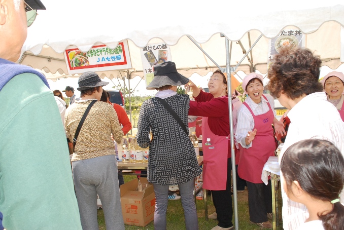 JA長生女性部が、お祭り広場でたまねぎの酢漬けの無料配布と、女性部員が考案した「しらこ玉たま丼」や焼きそばを販売しました。他のブースではオニオンフライの試食や、たまねぎドレッシング、野菜の直売なども出店していました。白子町玉葱出荷組合もたまねぎを販売し、2時間ほどで完売してしまい、とても人気でした。