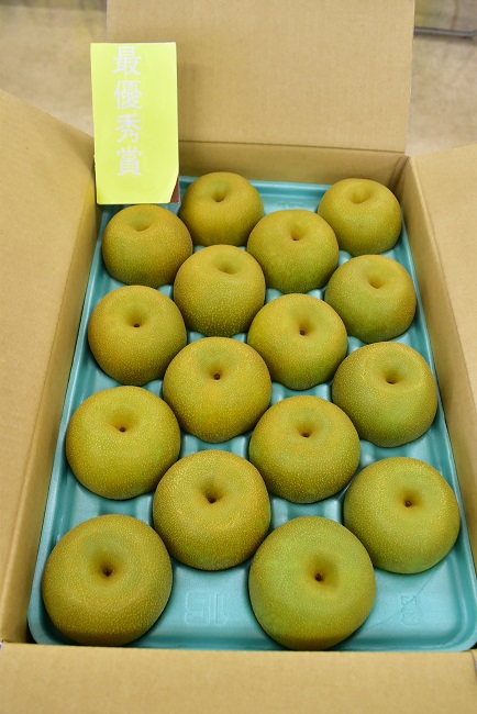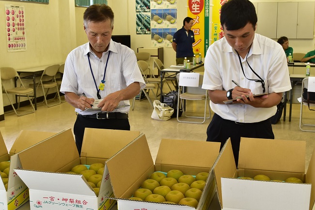 JA長生主催で、JAグリーンウェーブ長生にてながいき梨「幸水」共進会を開催しました。一宮・岬梨組合の生産者から16点出品され、審査員7名で糖度の計測と形状や箱内の揃い等の外観審査を行いました。厳正なる審査の結果、一宮町の高師秀一さんが5年連続で最優秀賞に輝きました。