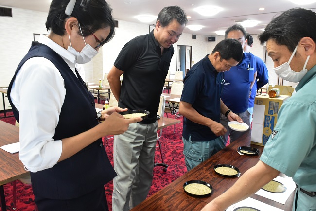 令和6年産米集荷に向けて、令和6年産米集荷に向けて農産物検査員の目揃え会を行いました。約20人の農産物検査員が参加し、整粒歩合や水分量などを確認し検査基準の統一を図りました。9月中旬までに20万俵(1俵60㎏)の集荷を計画しています。